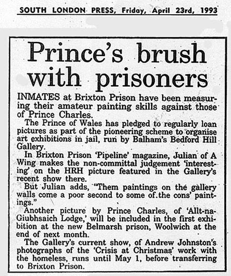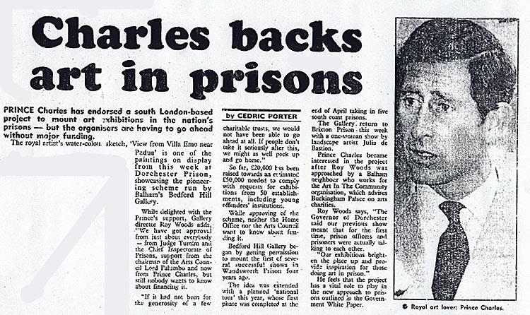 The idea behind the project was to “bring some colour into prisoners’ lives”. The project was approved by the Home Office and supported by HM Prison Service. At the time 50 prisons across the country wanted to take part in the scheme. The Bedford Hill Gallery managed through fundraising to put up art exhibitions in 15 prisons. Paintings by London based artists, including a number of works by Prince Charles, were exhibited in prisons, and the response from prison inmates and staff was highly positive.