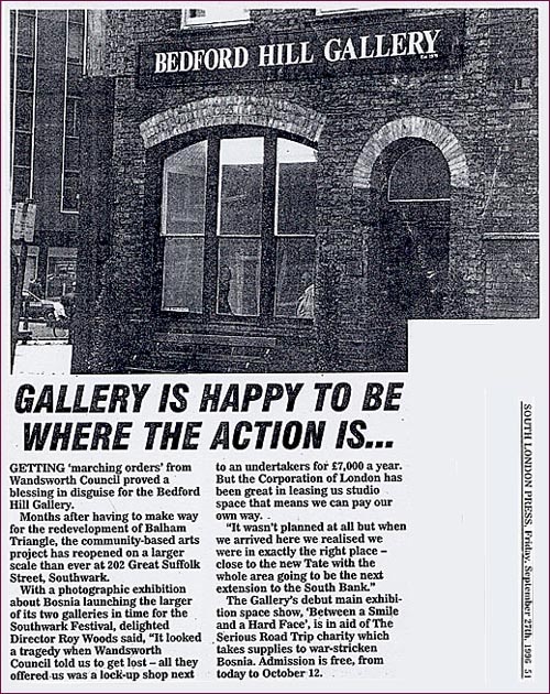 In 1996 Bedford Hill Gallery opened a new 3,000 sq ft gallery in Great Suffolk Street at London Bridge after being forced by Wandsworth Council to leave their premises and close their community art centre in Balham.